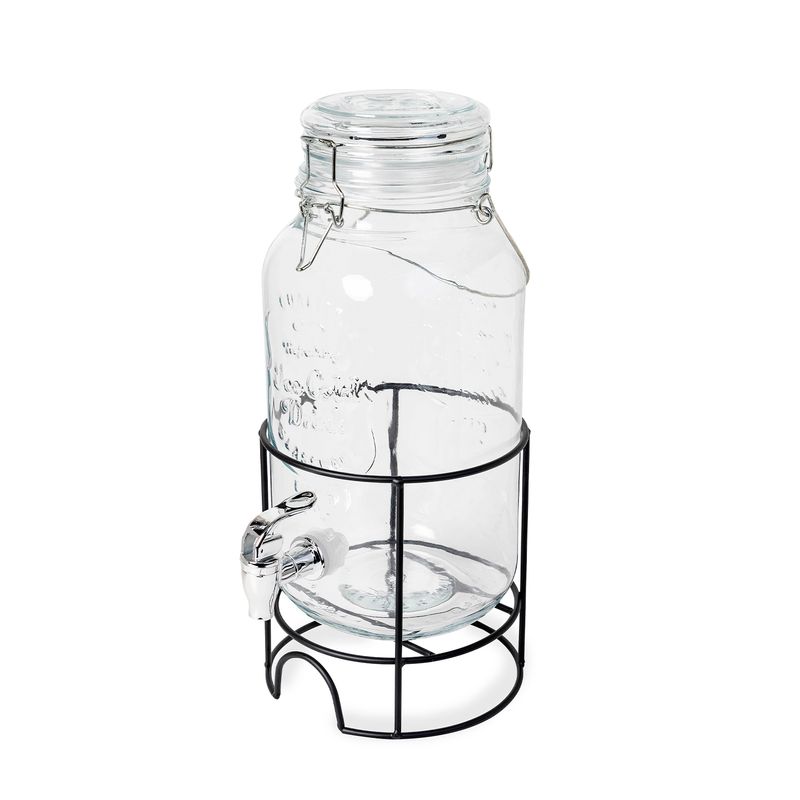Dispensador de vidrio transparente, tapa de vidrio, super resistente con capacidad de 3.8 litros, viene con dispensador de plástico cromado con ajustes de goma y soporte de acero pintado de color negro. Ideal para jugos, agua, refrescos o lo que más gustes. Le dará un toque elegante a tus eventos y reuniones. Medidas Largo: 17 cm, Ancho: 16.5 cm y Alto: 39.5 cm.