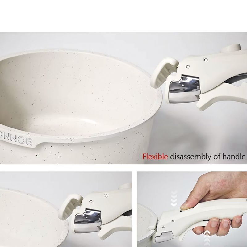 Juego de ollas antiadherente blanco de 17 piezas con mango extraíble. Versátil y práctico, ideal para cocinar y almacenar con facilidad. Compatible con diversas cocinas.