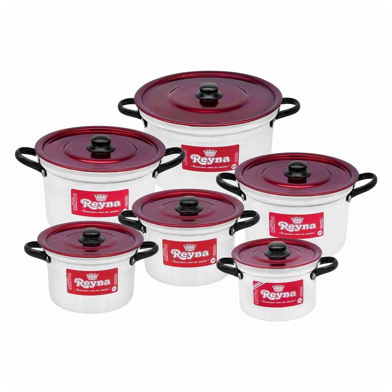 Juego de Ollas de Aluminio con Tapa Roja 6 piezas (N°16,18,20,22,24,26) de la marca Reyna. Un set práctico, resistente y con un acabado moderno en color rojo que aporta estilo a tus preparaciones. Diseñado para el uso diario, este juego ofrece ollas de diferentes tamaños para que puedas cocinar desde porciones pequeñas hasta recetas más abundantes con total comodidad.